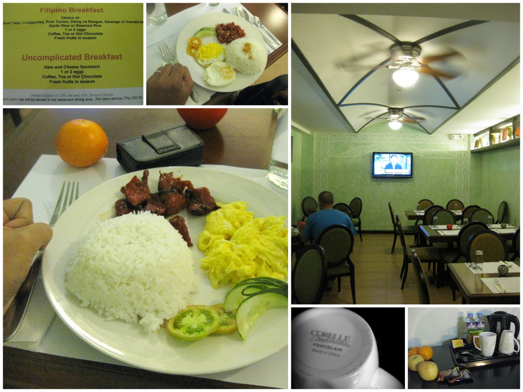 breakfast options | Roy's meal | the dining area | complimentary coffee and bottled water plus my fruits for the rest of our stay. Spartans can't go hungry! | My breakfast |